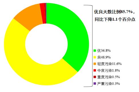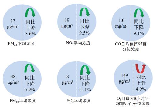 1—9月,全國339個地級及以上城市平均空氣質量優良天數比例為85.7%,同比下降1.1個百分點;PM2.5平均濃度為27微克/立方米,同比下降3.6%;PM10平均濃度為48微克/立方米,同比下降5.9%;O3平均濃度為149微克/立方米,同比上升4.9%;SO2平均濃度為8微克/立方米,同比下降11.1%;NO2平均濃度為19微克/立方米,同比下降9.5%;CO平均濃度為1.0毫克/立方米,同比下降9.1%。